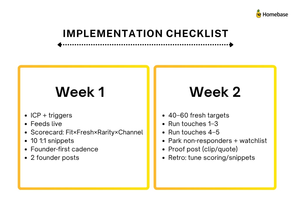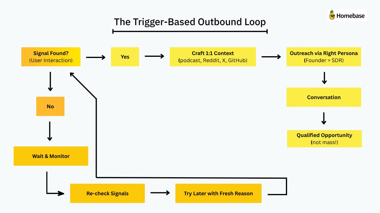 - Trigger Loop Framework: Signal → 1:1 context → founder-led outreach → pipeline