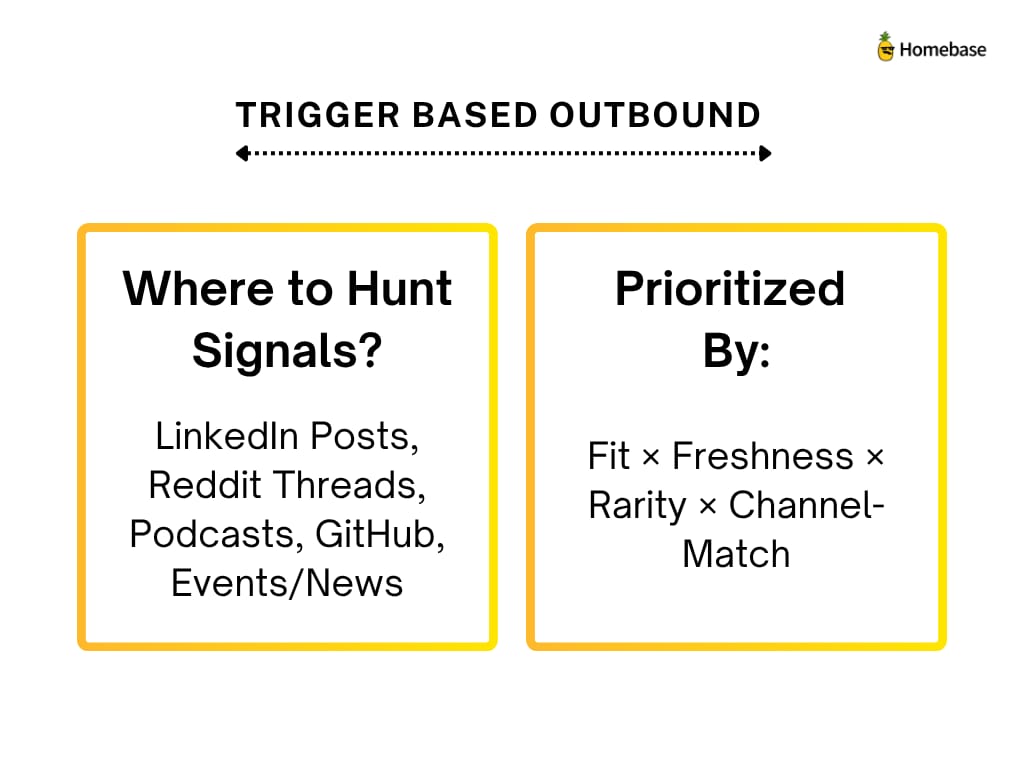 - Signal discovery → hunt for fresh, person-level triggers across channels.