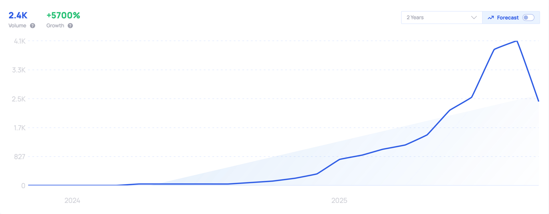 Growth: Search demand is 2.4K/month with +5700% growth, placing “AI agentic” among fast‑rising tracked topics and indicating sustained momentum across enterprise use‑case exploration.